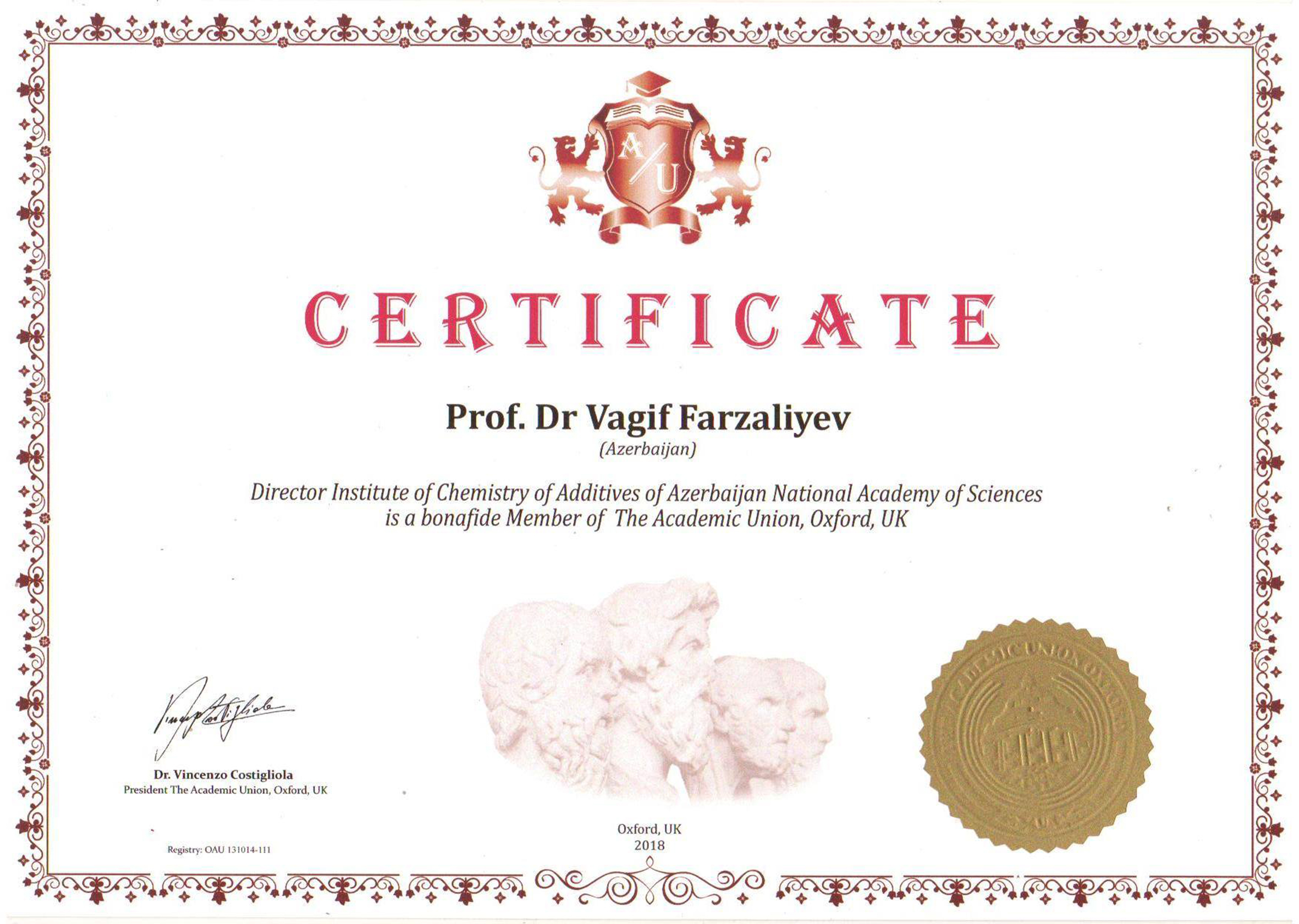 Akademik Vaqif Fərzəliyevə Oksford Akademik Birliyinə üzvlük atributları təqdim olunub