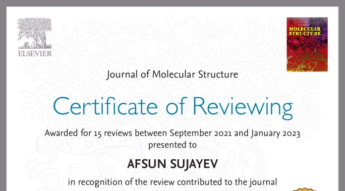 Executive Director of the Institute of Chemistry of Additives of the Ministry of Science and Education of the Republic of Azerbaijan, Doctor of Chemical Sciences, Associate Professor Afsun Sujayev was awarded the International Reviewer Certificate by the editors of the Journal of Molecular Structure of the Elsevier Publishing House.