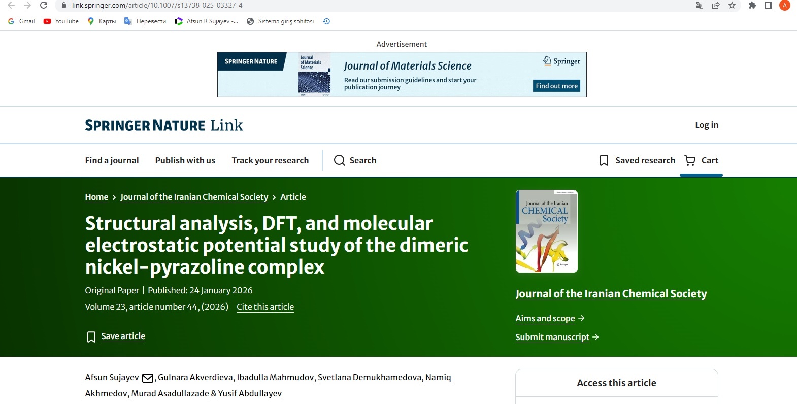 Azərbaycan Respublikası Elm və Təhsil Nazirliyinin “Kimya İnstitutu” Publik Hüquqi Şəxs və Bakı Dövlət Universitetinin Fizika Problemləri İnstitutunun bir qrup aparıcı alimləri “Dimer formasında aldıqları nikel-pirazolin kompleksinin struktur təhlili, DFT və molekulyar elektrostatik potensial tədqiqi” mövzusunda bəzi zərif üzvi sintez reaksiyaların nəzəri-təcrübi mexanizimində kompüter kimyəvi hesablamaların tətbiqi ilə bağlı istiqamətində beynəlxalq səviyyəli müştərək tədqiqatlar aparmış və aldıqları mühüm nəticələrdən bəhs edən məqaləni Web of Science bazasında indekslənən impakt faktoru 2.3 olan İran Kimya Cəmiyyətinin jurnalında (Journal of the Iranian Chemical Society) nəşr etdirmişlər (https://link.springer.com/article/10.1007/s13738-025-03327-4).